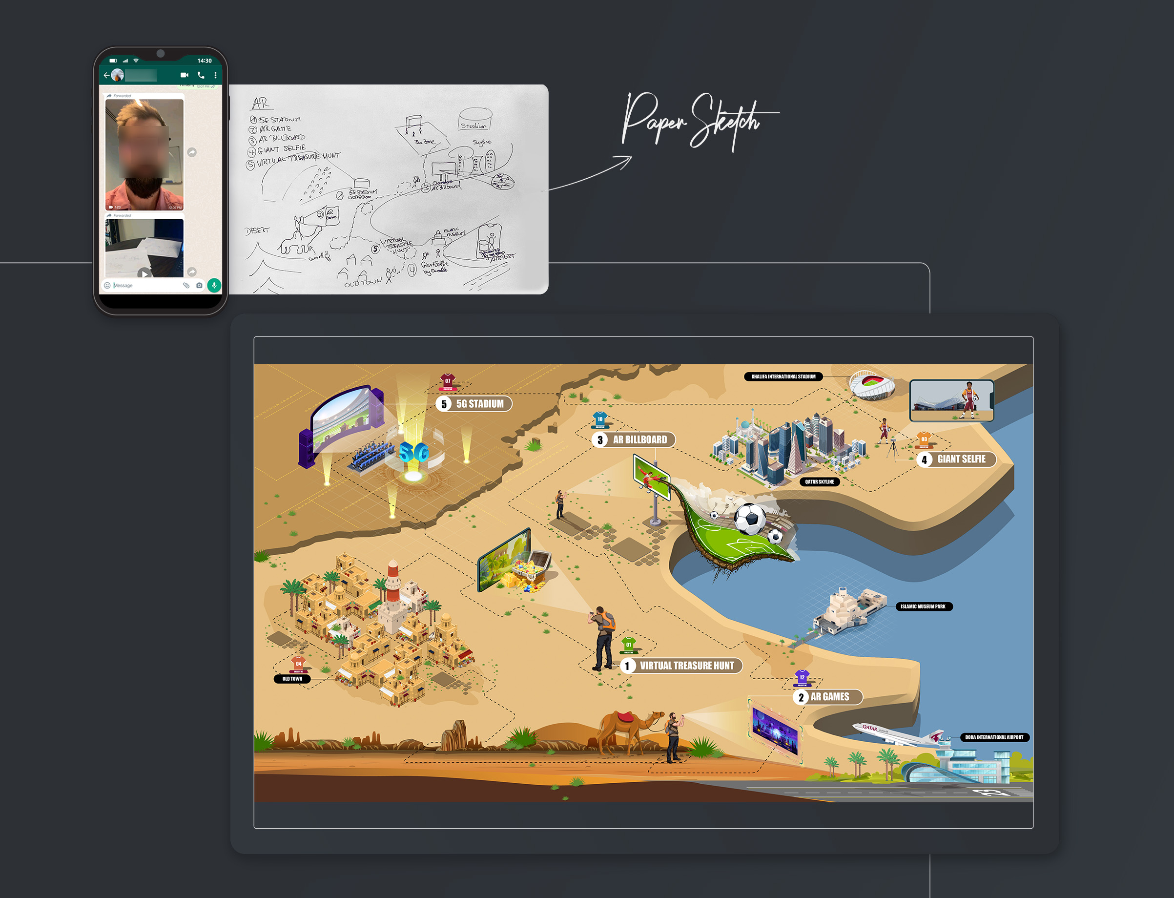 An isometric infographic illustrating the progression from AR virtual treasure hunts to AR billboards and finally to AR games within a 5G stadium, all inspired by the world of AR street art during the Qatar FIFA Cup.