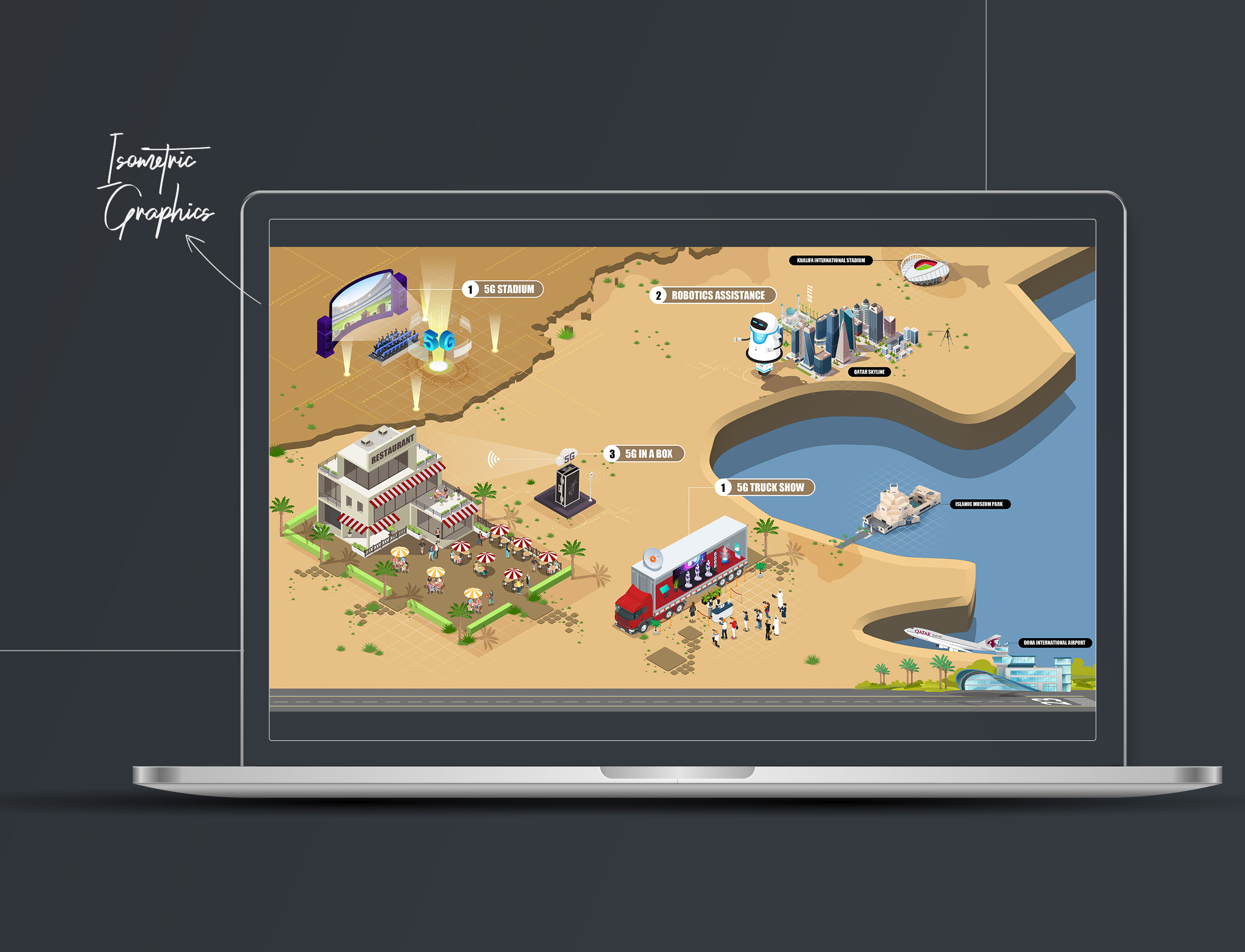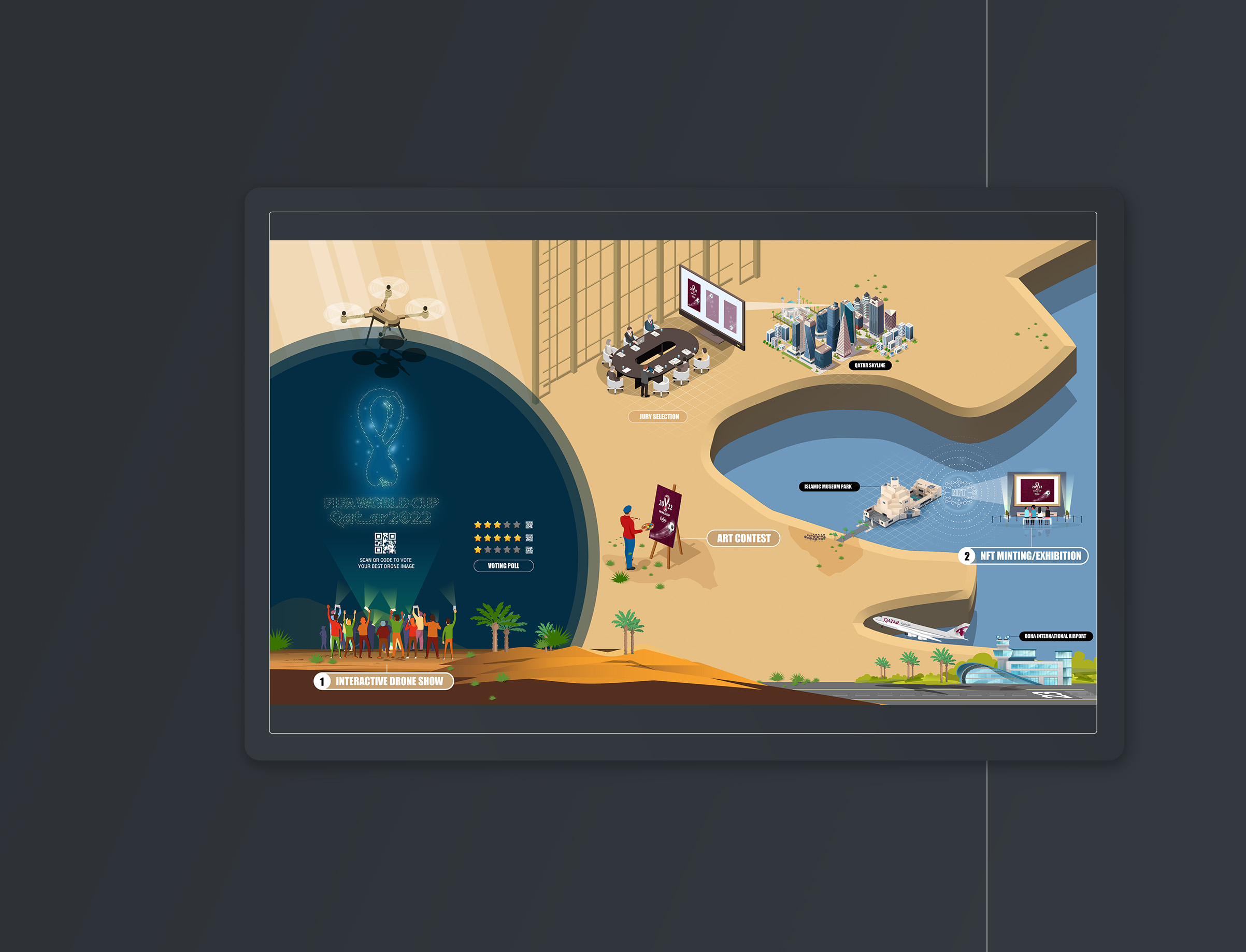 Now, let’s check out some simple isometric infographics that show different activities during the Qatar FIFA Cup, blending AR street art with the excitement of the event: